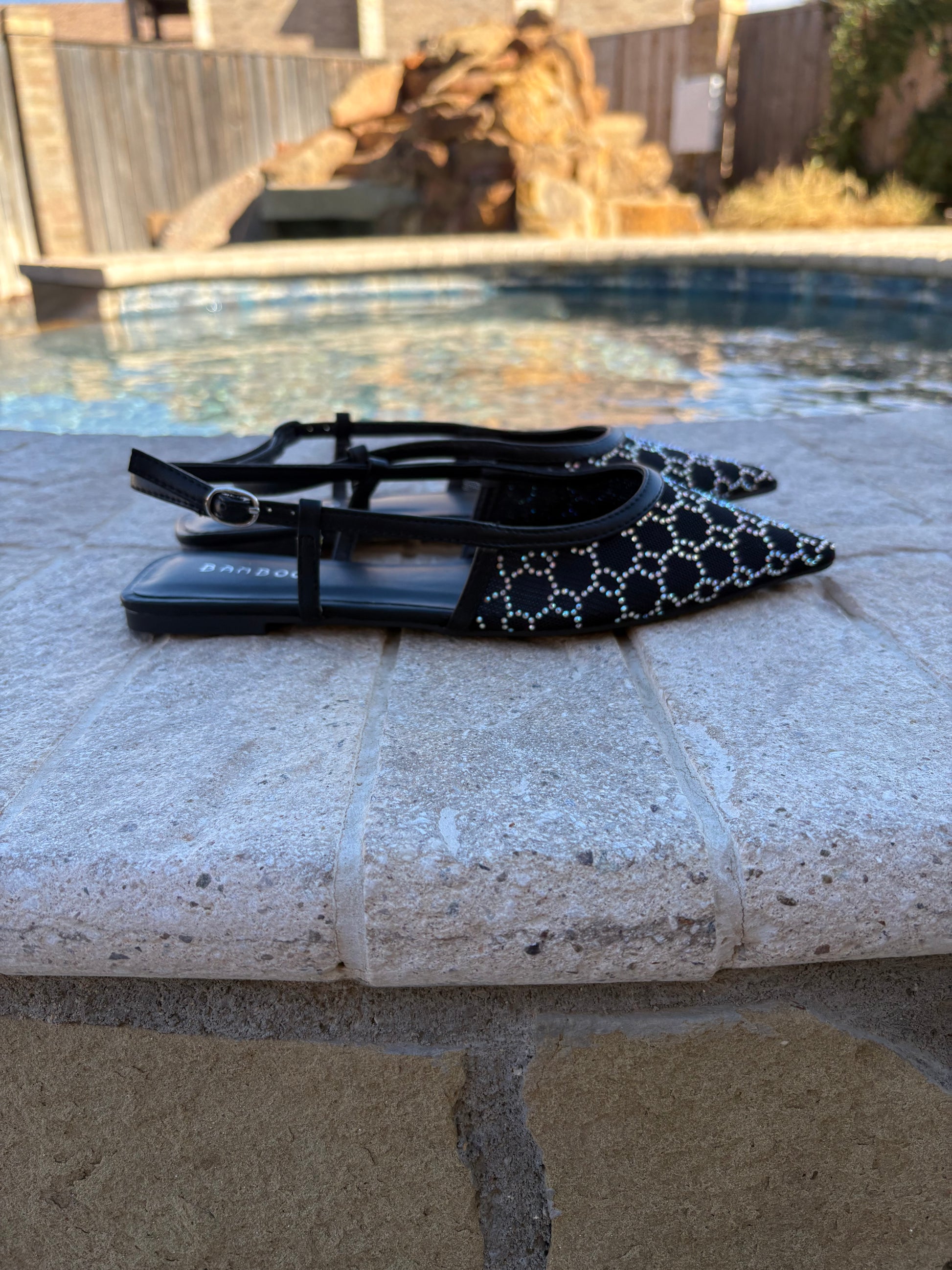 Sleek and sophisticated, these black slingback flats feature a polished pointed toe with a subtle touch of embellishment. Elegant, comfortable, and effortlessly chic the perfect finish to any outfit.